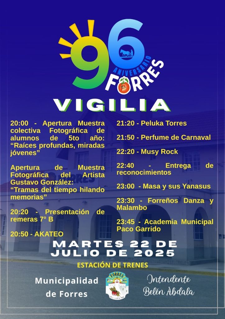22.07.25 La Municipalidad de Forres, a cargo de la intendenta, María Belén Abdala, viene desarrollando un vasto y novedoso programa de actividades en el marco de los festejos por el 96 aniversario de su fundación, cuya fecha central es el día miércoles 23 de julio.